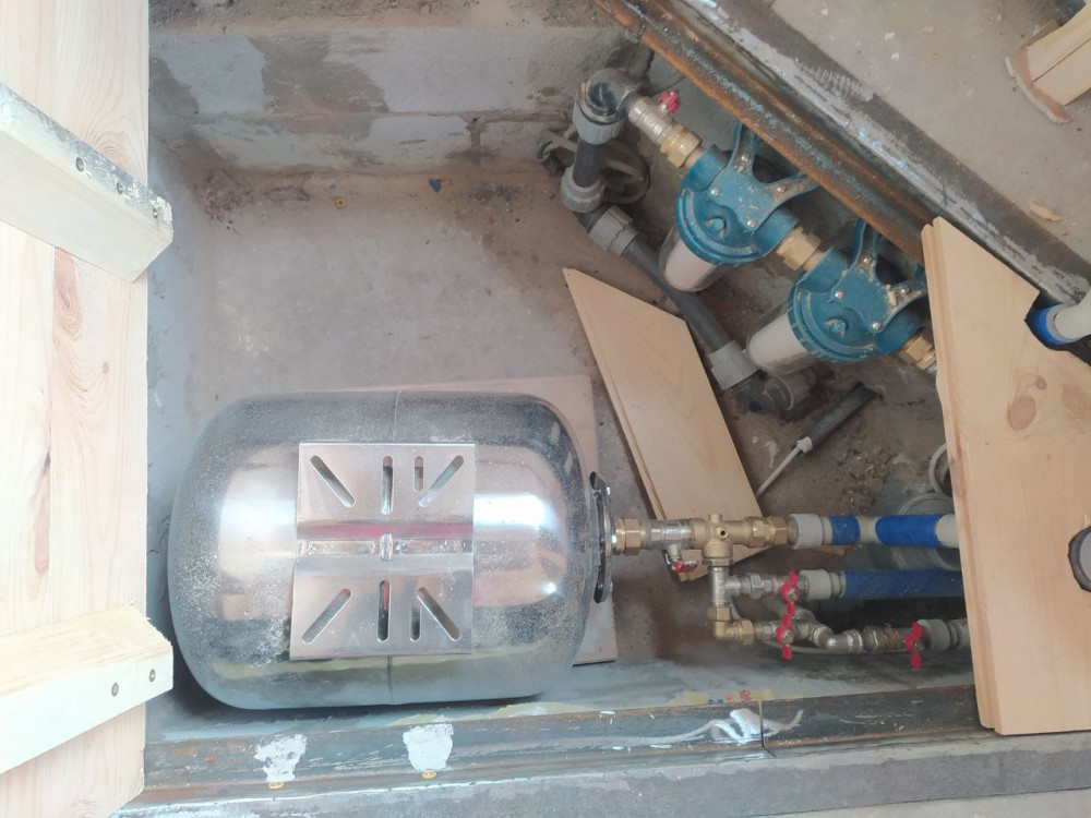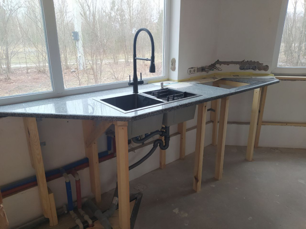 ✅ Кухня та оснащення: Підведено воду до будинку та змонтовано каналізацію. Встановлено стільницю, двосекційну мийку з раковиною, крани та фільтри для води. Встановлено газову плиту. Додано також додаткову стільницю з поличками під вікном.